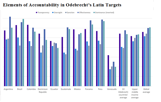 - The comparison yields mixed findings. On average, the nations implicated in the Odebrecht settlement do quite well on transparency, effectiveness, and political dominance – the outcome of a generation of democratic rule (with Venezuela being the obvious outlier). But all ten countries perform comparatively poorly when it comes to oversight, and abysmally when the criterion is sanction. This does not bode well for accountability, especially if we consider that among the Odebrecht Latin Ten, the highest-scoring country on the sanction criteria is Argentina, whose score is still below the middle-income country average. In Brazil, where trial courts have led the way in imposing sanctions on business elites, political leaders are nonetheless protected against meaningful sanctions by an arcane system of privileged standing in the high courts.